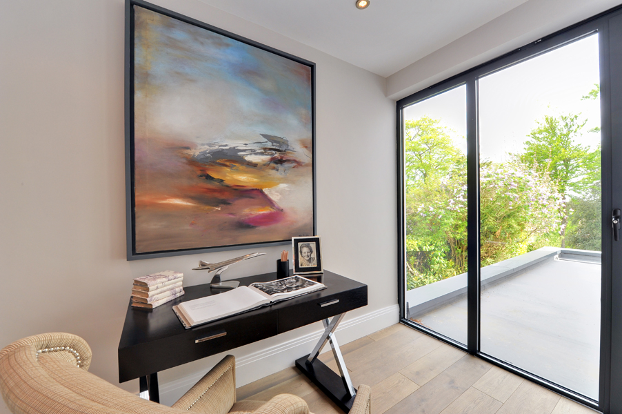 On the opposite side of the hallway is a kitchen, family-room and informal entertaining space. Concertinaed sliding-doors open onto a series of terraces. The ‘blade-of-glass’ balconies provide uninterrupted views over the Chantries – part of the Surrey Hills.